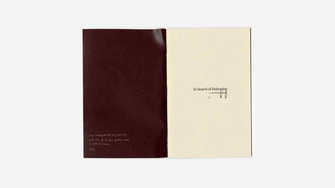 In Search of Belonging is a three-part series that explores the identity of someone with a multicultural upbringing. Three books signify three cultures and experiences, the culture of my background, environment, and current space. This piece explores the experience of growing up abroad and how it impacts one’s identity and sense of belonging through real scans of past mementos, more forms of mixed media, and a personal narrative. The lost sense of belonging is a familiar feeling to many with a multicultural upbringing—the feeling of being a foreigner in your own home, the constant search for belonging, and the uncertainty that lies within you and your future. However, we soon find a new identity emerging within one another. We find “home” in people, not in places.